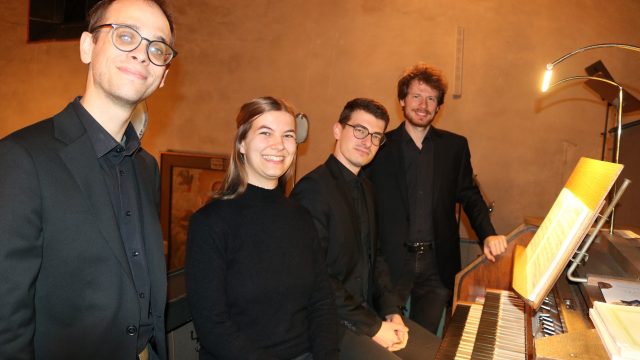 Zum Abschluss des Konzerts, das für das Alsfelder Publikum einen wirklich außergewöhnlichen musikalischen Genuss bedeutete, taten sich Christian Karl und seine Cousine Sonja Karl an der Orgel zusammen. Christian Karl, Kirchenmusiker in Alpirsbach, spielte die ersten beiden Sätze der 1. Sonate in f-Moll, Sonja Karl, derzeit im Masterstudiengang als Kirchenmusikerin, brachte die Sätze drei und vier dar. Nicht enden wollender Applaus zeigte den elf Musikern, dass sie dem Publikum einen berührenden musikalischen Abend geschenkt hatten, der noch nicht zu Ende war: Mit ihrem gesungenen Segen „Verleih uns Frieden gnädiglich“ – begleitet von Henrik Schlitt an der Orgel und gesanglich unterstützt von Antje Margolf – bezauberten die Organisten die Gäste in der Dreifaltigkeitskirche bis zum allerletzten Moment.