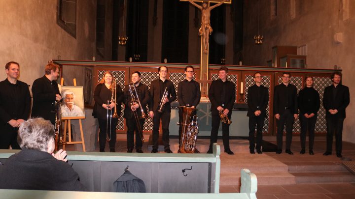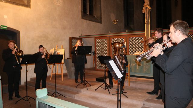 Dem improvisierenden Stück zu Beginn des Konzerts folgte die „Fantasie und Fuge g-Moll“ von Bach, mit Leidenschaft und großer Spielfreude dargeboten von Lukas Ruckelshausen, Kirchenmusiker in Frankfurt-Nied. Für einen Zeitsprung sorgte danach das Bläserseptett unter der Leitung von Martin Wilhelm, der an der Albert-Schweitzer-Schule unter anderem die Bigband leitet. Er hatte aus den Reihen seiner ehemaligen Musiker Christoph Euler, Sarah Kuhla, Simeon Reibeling, Alexander Reinsch, Kilian Schütz und Florian Walther für das Konzert begeistern können – eine gute Wahl, wie das Publikum auf Anhieb feststellen konnte. Sie erfüllten – obwohl nur sieben Bläser – das Kirchenschiff mit ihrem Sound und ihrem akkuraten Zusammenspiel. „Spirit of Brass“ gaben sie zum Besten, gefolgt von dem Filmklassiker „Gabriella’s Song“ und einem selten gehörten Moriskentanz – „La mourisque“ – aus der Zeit der Spanischen Reconquista.