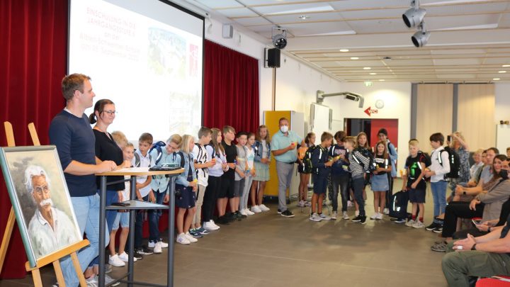 Auch Christian Bolduan, der die Neuankömmlinge und ihre Familien in der Schule begrüßte, ermutigte die Kinder zu diesem Schritt: „Ihr werdet neue Räume betreten, neue Menschen kennenlernen, neue Freunde finden und viel Neues lernen“, versprach er ihnen. Er lud sie ein, nach dem ersten Kennenlernen zu beginnen, ihre Fußabdrücke in der Schule zu hinterlassen: „Bringt euch ein, werdet Teil der Schulgemeinschaft!“ Bolduan äußerte auch Verständnis dafür, dass vielen Kindern von kleinen Grundschulen jetzt an einer Schule mit fast tausend Schülerinnen und Schülern vieles geradezu riesig erscheine, doch er versicherte ihnen: „Morgen schon kennt ihr eure neue Schule besser als heute. Und jeder neue Raum bietet eine neue Chance.“ Er sagte den frischgebackenen Albert-Schweitzer-Schülern zu, dass die ganze Schulgemeinde sich darum kümmere, dass es ihnen gutgehe. An die Eltern gerichtet bedeute dies, dass diese nun durchaus jeden Tag ein wenig mehr loslassen könnten und den Kindern damit zu mehr Selbstständigkeit und Selbstvertrauen verhelfen könnten. „Lassen Sie Ihre Kinder ihre Erfahrungen machen“, so Bolduans Appell, gefolgt von dem konkreten Wunsch, diese nicht mit dem Auto bis vor die Schulpforte zu fahren. Die Zeit an der Albert-Schweitzer-Schule solle Kinder auf dem Weg zu Selbstbestimmung, Freiheit, Bildung und Respekt begleiten – Werte, die auch den Namensgeber Albert Schweitzer angetrieben hätten.
