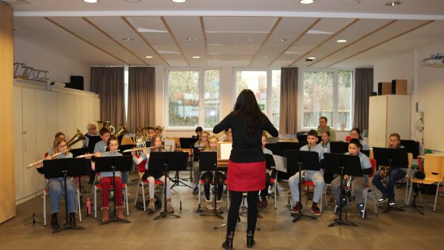 Die Bläserklasse unter der Leitung von Sandra Cimiotti begrüßte die Gäste und war gleichzeitig Teil der Präsentation: Denn die Fünftklässler spielen erst seit September auf ihren Instrumenten und beeindruckten die Familien mit ihren schönen Weihnachtsliedern.