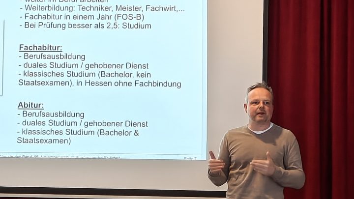 Den Auftakt machte Michael Rausch von der Agentur für Arbeit, der regelmäßig an den Schulen mit gymnasialer Oberstufe berät. Er stellte das hessische Bildungssystem als eine vielfältige Landschaft vor, die Schülerinnen und Schülern viele Möglichkeiten gibt. Ganz pragmatisch präsentierte er den Zehntklässlern mehrere Varianten: „Guter Leistungsstand, Ziel Abitur und noch kein Plan?“ Dann gelte der gute Rat: „Never change a running system“. Dann könne man gut an der vertrauten Albert-Schweitzer-Schule in die Oberstufe starten und das Abitur in drei Jahren anstreben. Variante zwei: Wenn alles gut läuft, das Abitur das ist Ziel, man aber schon genau weiß, in welche Fachrichtung es später einmal gehen solle, dann könne man schauen, ob vielleicht das Berufliche Gymnasium der Max-Eyth-Schule auch eine gute Möglichkeit sei. Als weitere Bildungsvariante stellte Rausch die Fachoberschule vor: Über sie könne man nachdenken, wenn am Gymnasium der Leitungsstand „nur so naja“ sei und man eigentlich etwas Praktisches anstrebe. Als Abschluss erreiche man das Fachabitur. Als vierte Variante biete sich eine Duale Berufsausbildung an. Diese könne man bereits nach der zehnten Klasse beginnen, wenn man nicht (mehr) das Abitur oder Fachabitur als Ziel habe. Alle vier Varianten bieten verschiedenste Perspektiven, die Rausch präsentierte: Nach einer Berufsausbildung kann man – bei Bedarf – einige Weiterbildungen anstreben, beispielsweise Techniker, Meister oder Fachwirt. Man kann auch das Fachabitur nachholen und im Anschluss daran studieren. Das Fachabitur wiederum bietet neben dem dualen oder klassischen Studium (letzteres mit dem Bachelor als Abschluss) auch die Möglichkeit der Berufsausbildung. Mit dem Abitur schließlich stehen den Absolventen alle Wege offen. Die Zehntklässler erfuhren, welche Fachrichtungen sie in Alsfeld, Lauterbach oder Gießen an den Beruflichen Gymnasien und Fachoberschulen vorfinden: Von Technik über Wirtschaft, Soziales, Gesundheit oder Gestaltung gibt es ein breites Angebot.