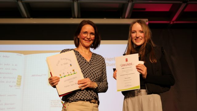 Martin Wilhelm präsentierte schließlich die Preisträger im mathematisch-naturwissenschaftlichen Bereich: Sowohl im Mathematikwettbewerb der Stufe 8 (verpflichtend) als auch im freiwilligen Känguru-Wettbewerb hatten die Schülerinnen und Schüler der ASS im vergangenen Jahr gut abgeschnitten. Mit Emma-Sophie Herget wurde zudem die Kreissiegerin im Antolin Lesewettbewerb ausgezeichnet. Einen weiteren hochinteressanten Wettbewerb, an dem die Schule teilnahm, stellte Gabriele Koch vor: Sie zeichnete drei Schülerinnen für ihre erfolgreiche Teilnahme am BUND-Jugend-Wettbewerb „Naturtagebuch“ aus. Marlene Appel zeigte den Gästen, was genau es damit auf sich hat und beeindruckte wie die Geehrte vor ihr das Publikum mit ihrem Beitrag.